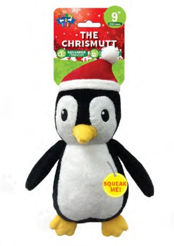 Introducing The Chrismutt Penguin - Christmas Plush Dog Play Toy. Make this holiday season extra special for your furry friend with The Chrismutt Penguin, the ultimate festive dog toy. Crafted with love and care, this 9-inch plush toy is designed to bring joy to your pet's Christmas celebrations. Watch your dog's tail wag with excitement as they discover the delightful surprises this toy has to offer. This holiday season, make your pet's dreams come true with The Chrismutt Penguin. Order now and give your furry friend a memorable Christmas filled with fun, laughter, and festive cheer. Make this Christmas one to remember for your beloved pet with the perfect gift - The Chrismutt Penguin. Please note that while The Chrismutt Penguin is designed with your pet's enjoyment in mind, it's essential to supervise your dog during playtime to ensure their safety. Available in two sizes 9 inch and 16 inch.